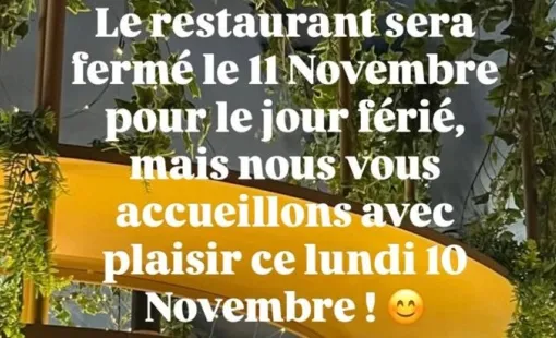 Le restaurant sera fermé le mardi 11 novembre, nous aurons le plaisir de vous retrouver le mercredi 12 novembre pour le déjeuner.